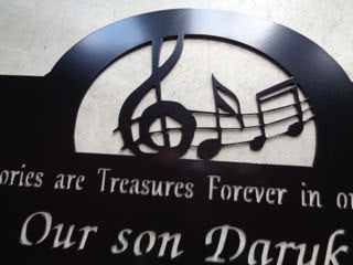 Gorgeous metal memorial sign with notes for the music lover ..Makes a very meaningful gift to someone whos lost a loved one. Finish is a durable baked on powder coat finish. Also available is acid washes with baked on clear coat. Measures 20" wide by 10.6" tall on top of 10" stakes